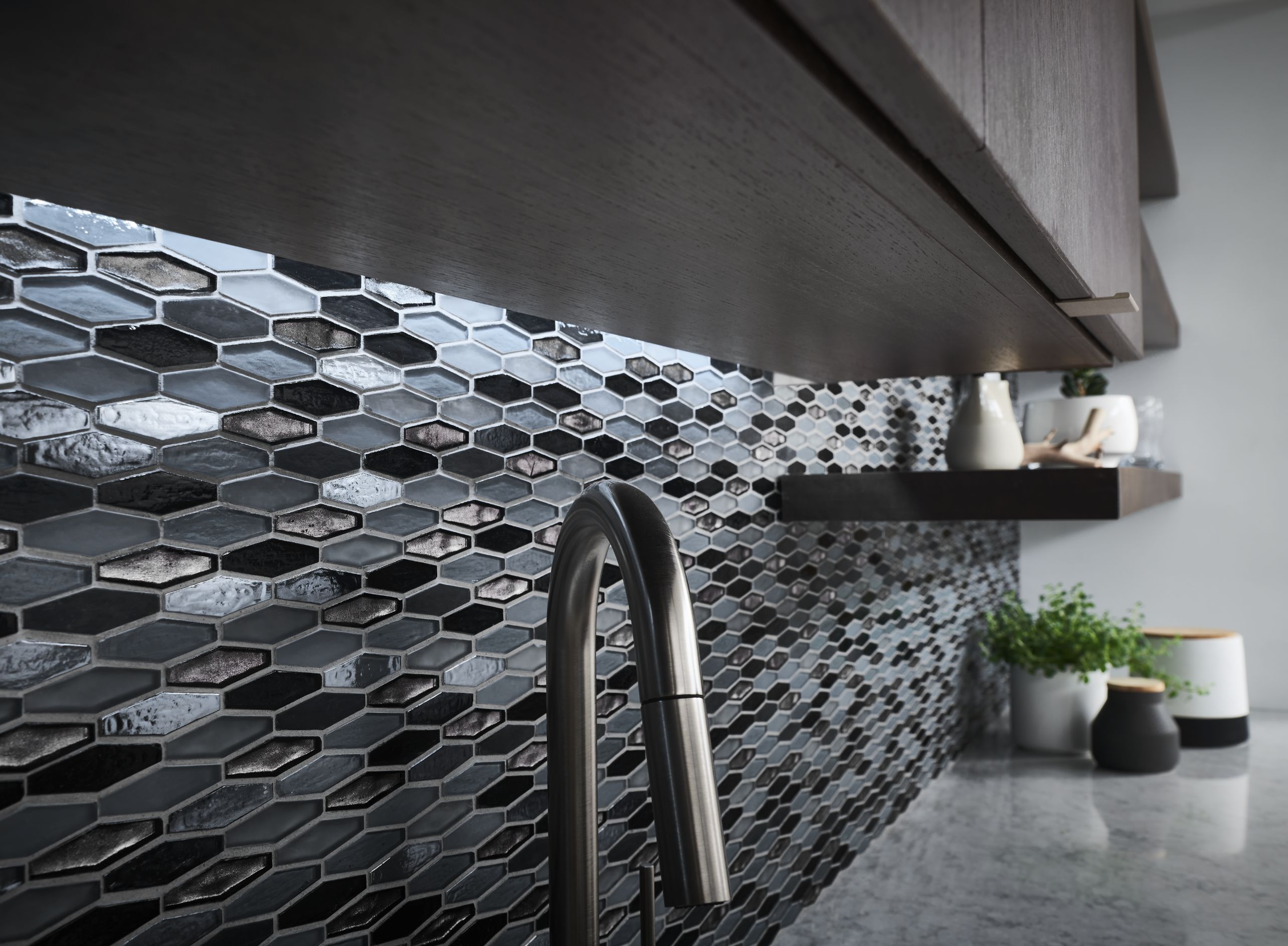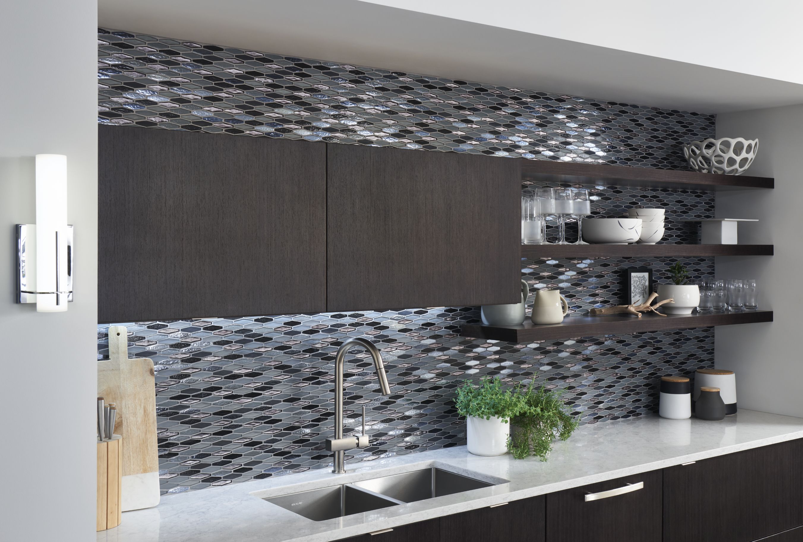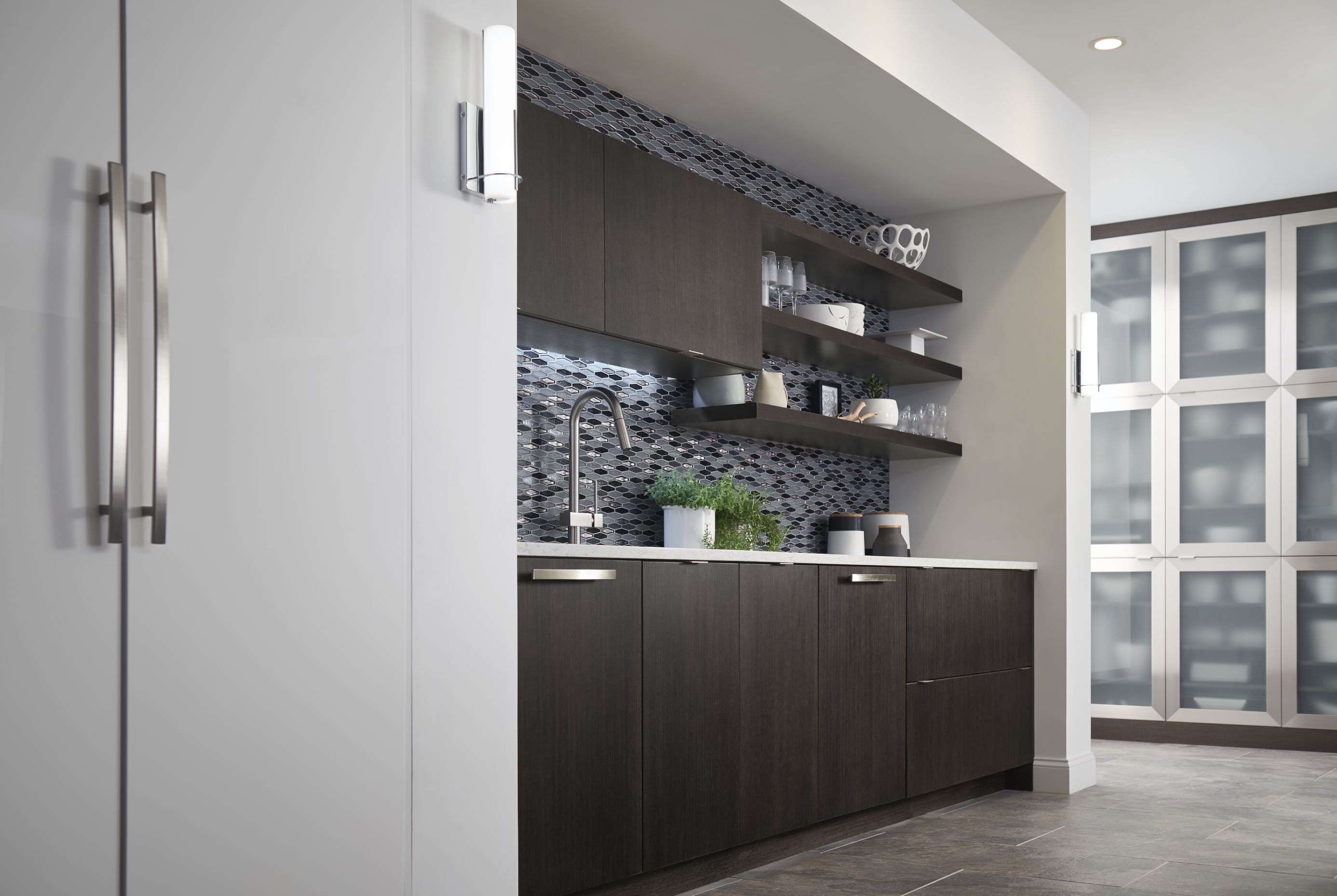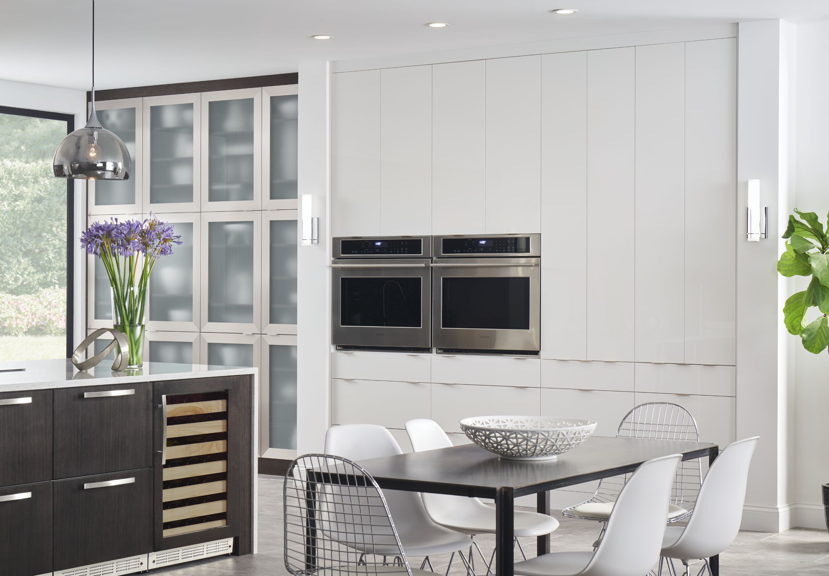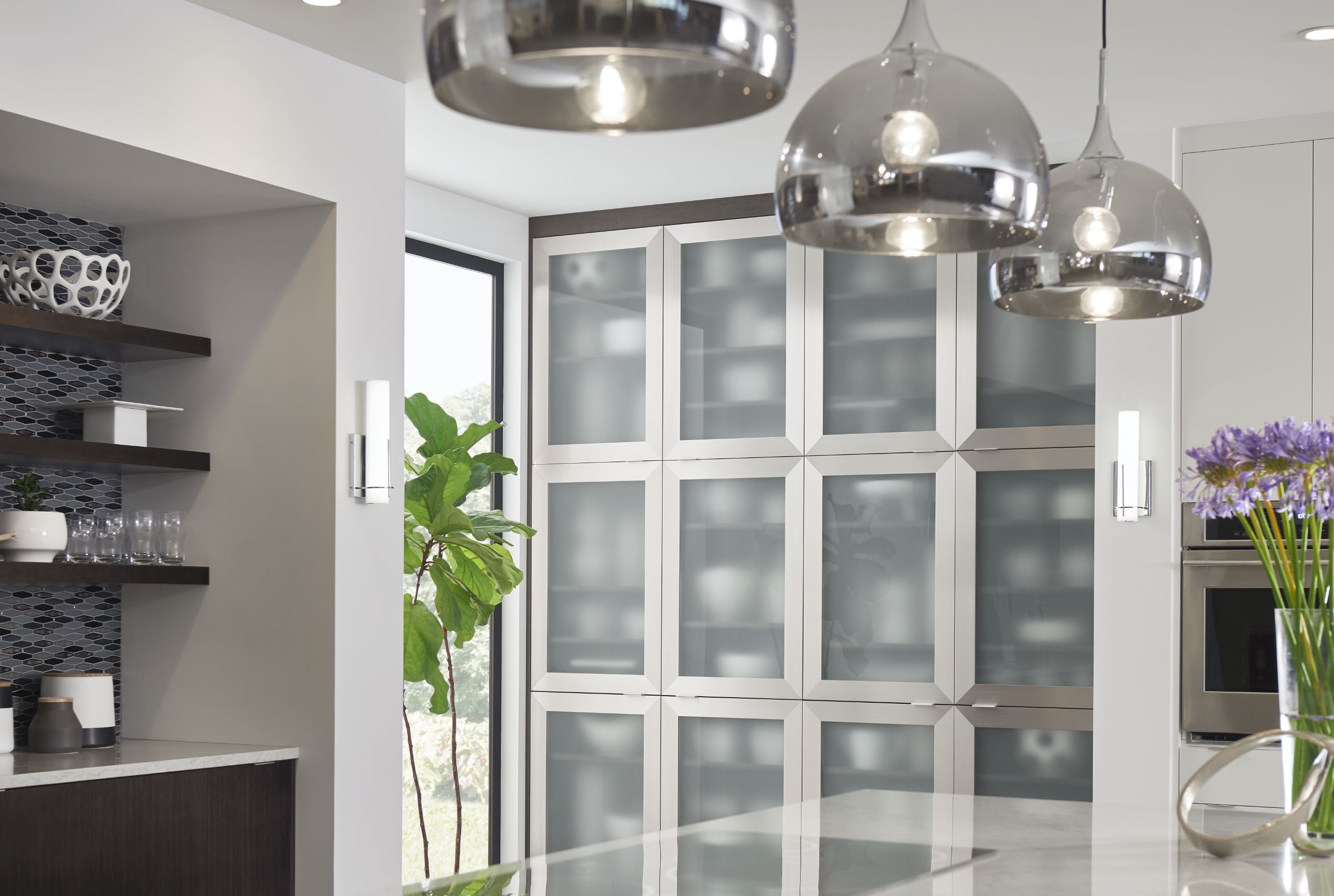 Bella in Smoke on heartwood; Gibson in White Dahlia acrylic; with Carlton Brushed Stainless Steel and Frosted glass.