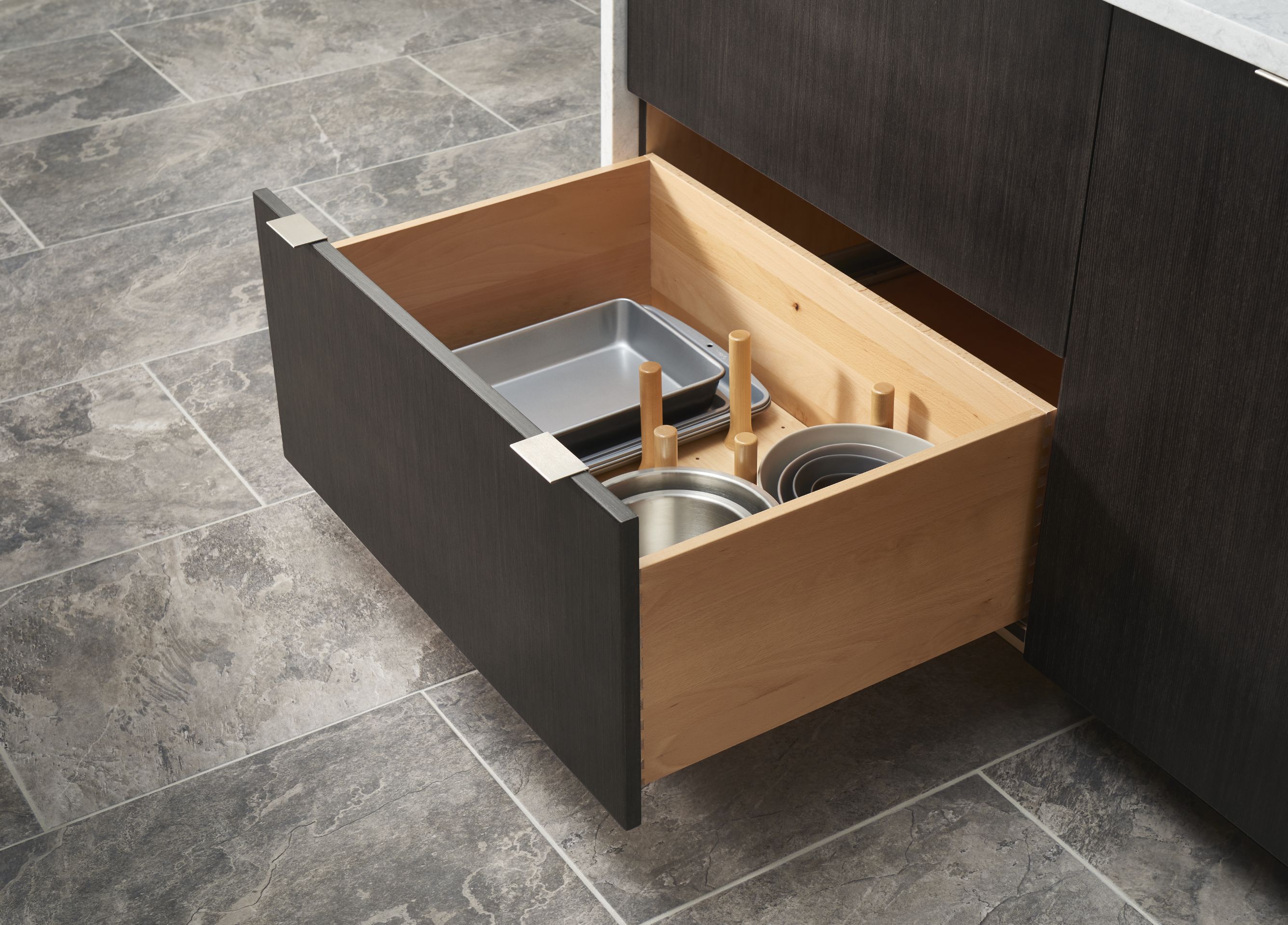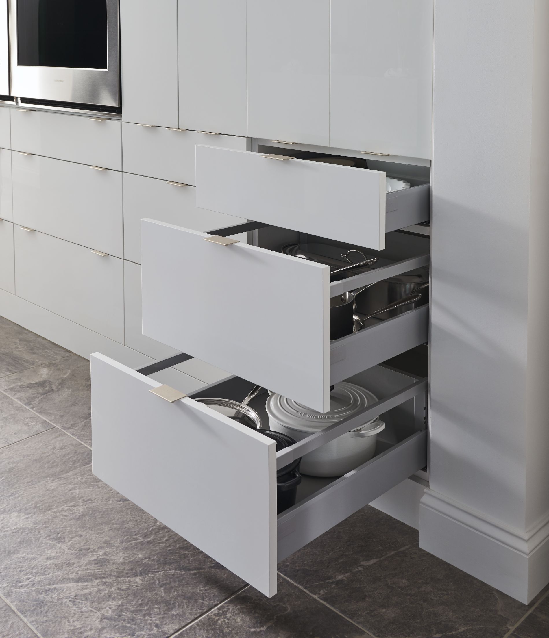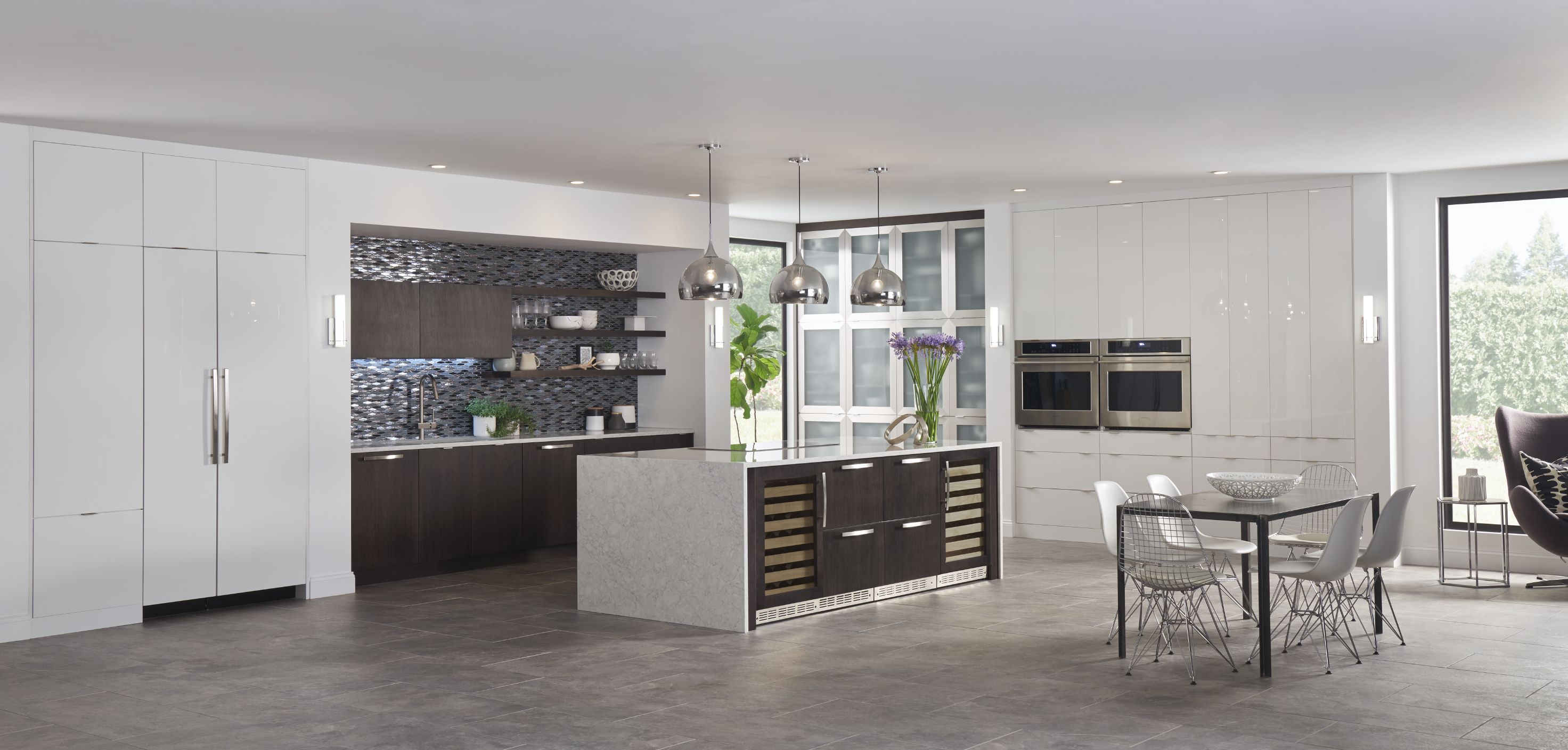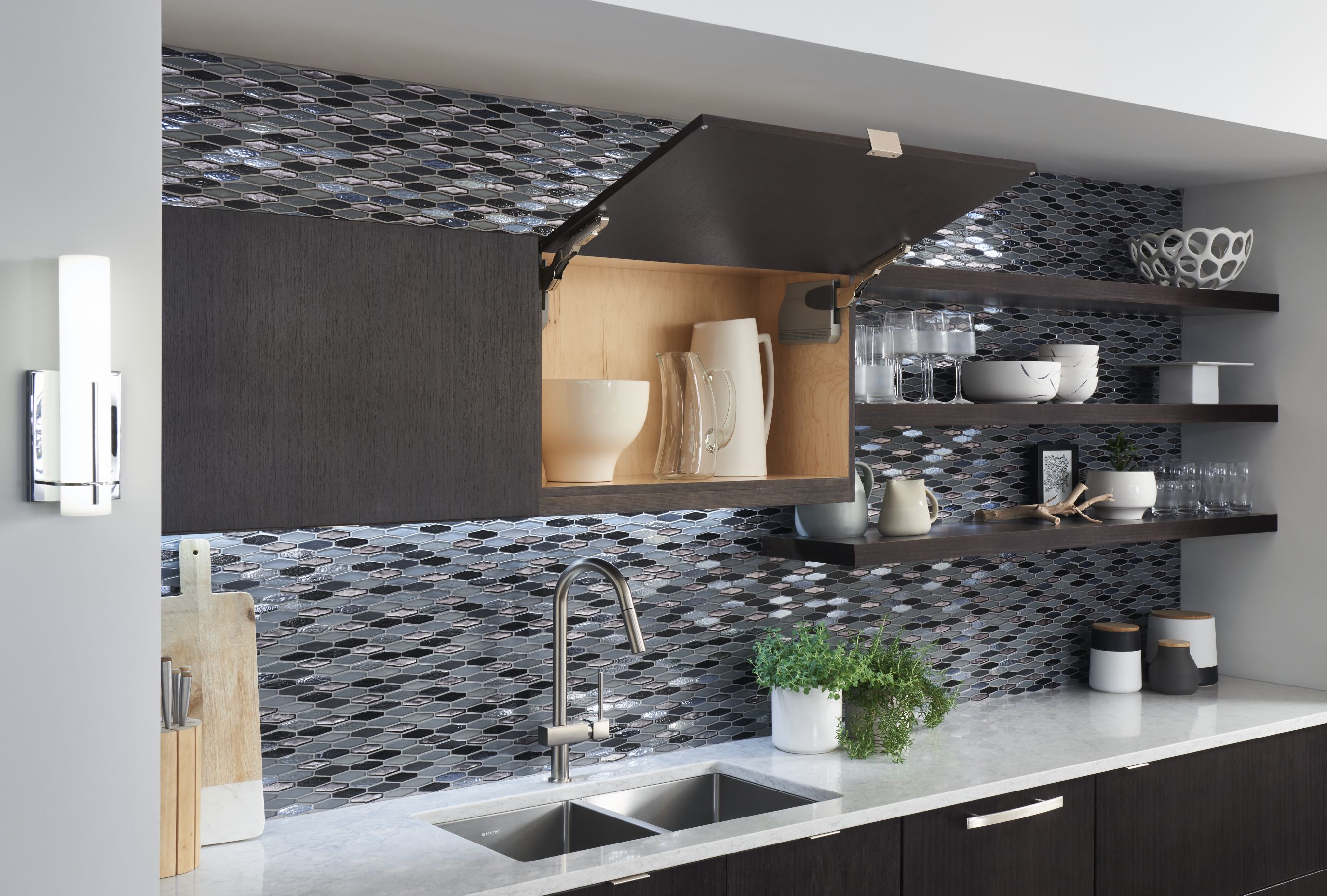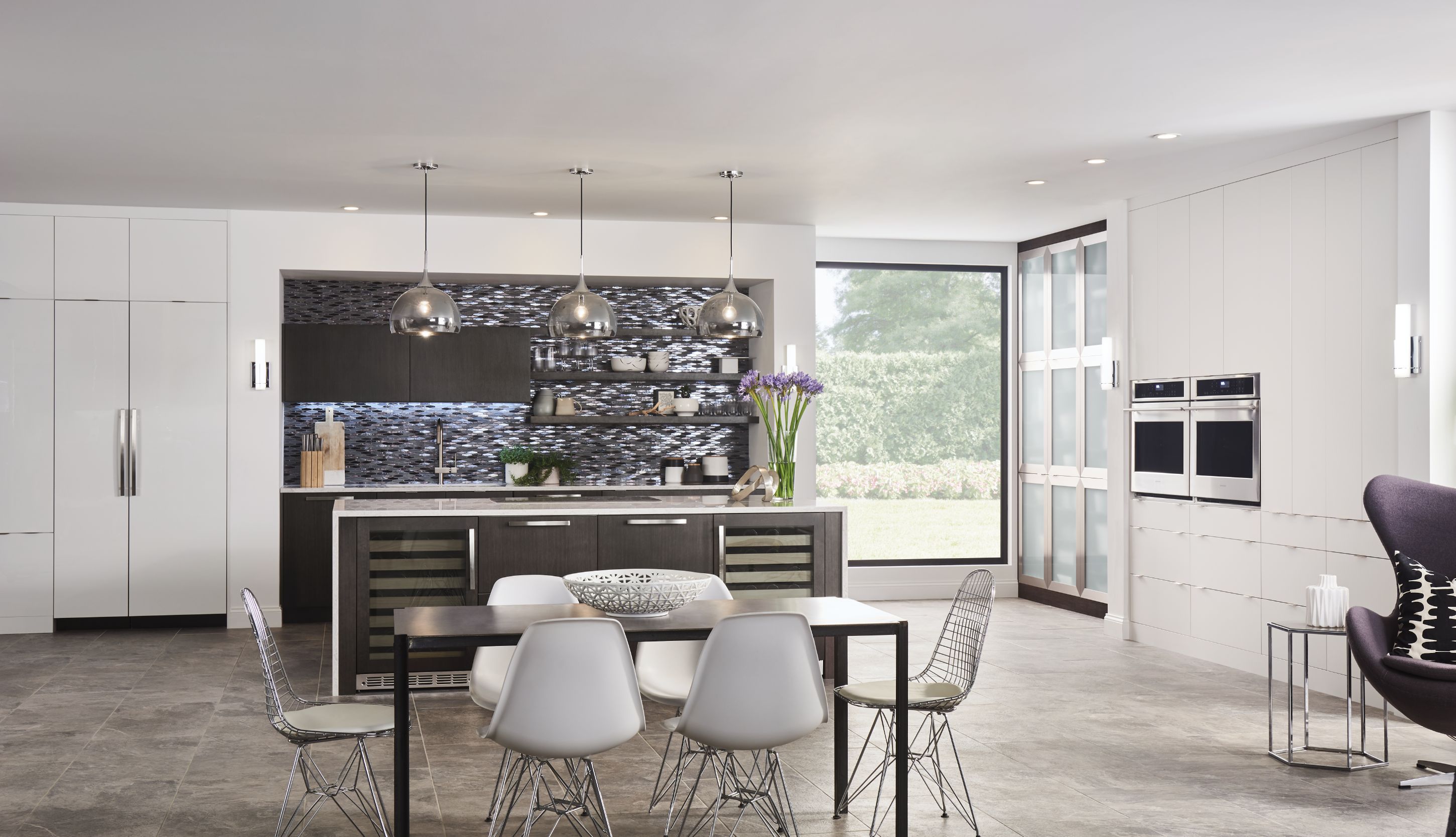 Bella in Smoke on heartwood; Gibson in White Dahlia acrylic; with Carlton Brushed Stainless Steel and Frosted glass.