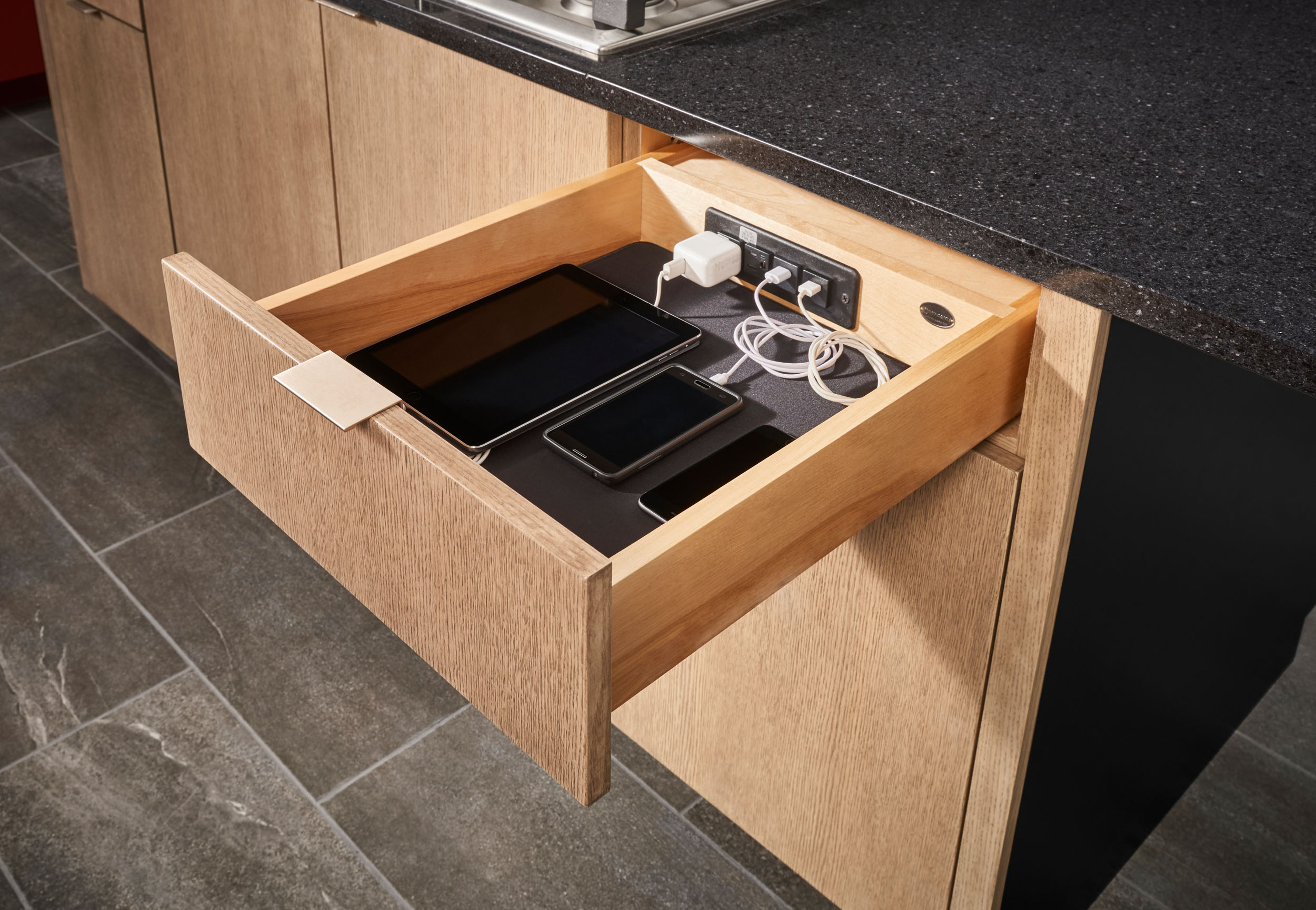 Keep kitchen countertops clear of cords! This specialized drawer has built-in electrical outlets, ready to charge all your mobile devices.