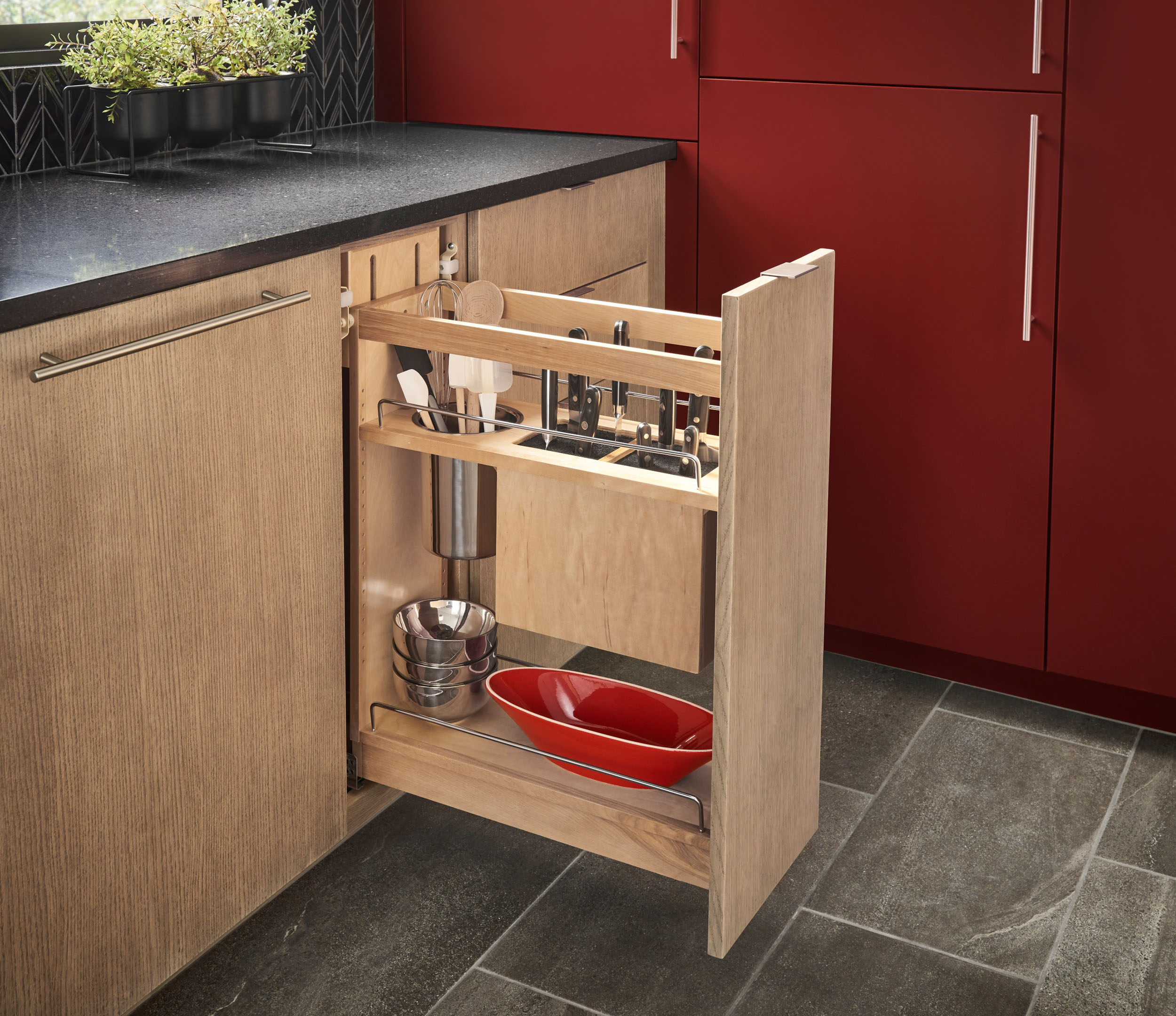 Maintain clean, uncluttered countertops by concealing a clever knife block inside this kitchen cabinet that pulls-out to reveal full access to everything stored inside, including a lower bonus shelf for dishes and small appliances.